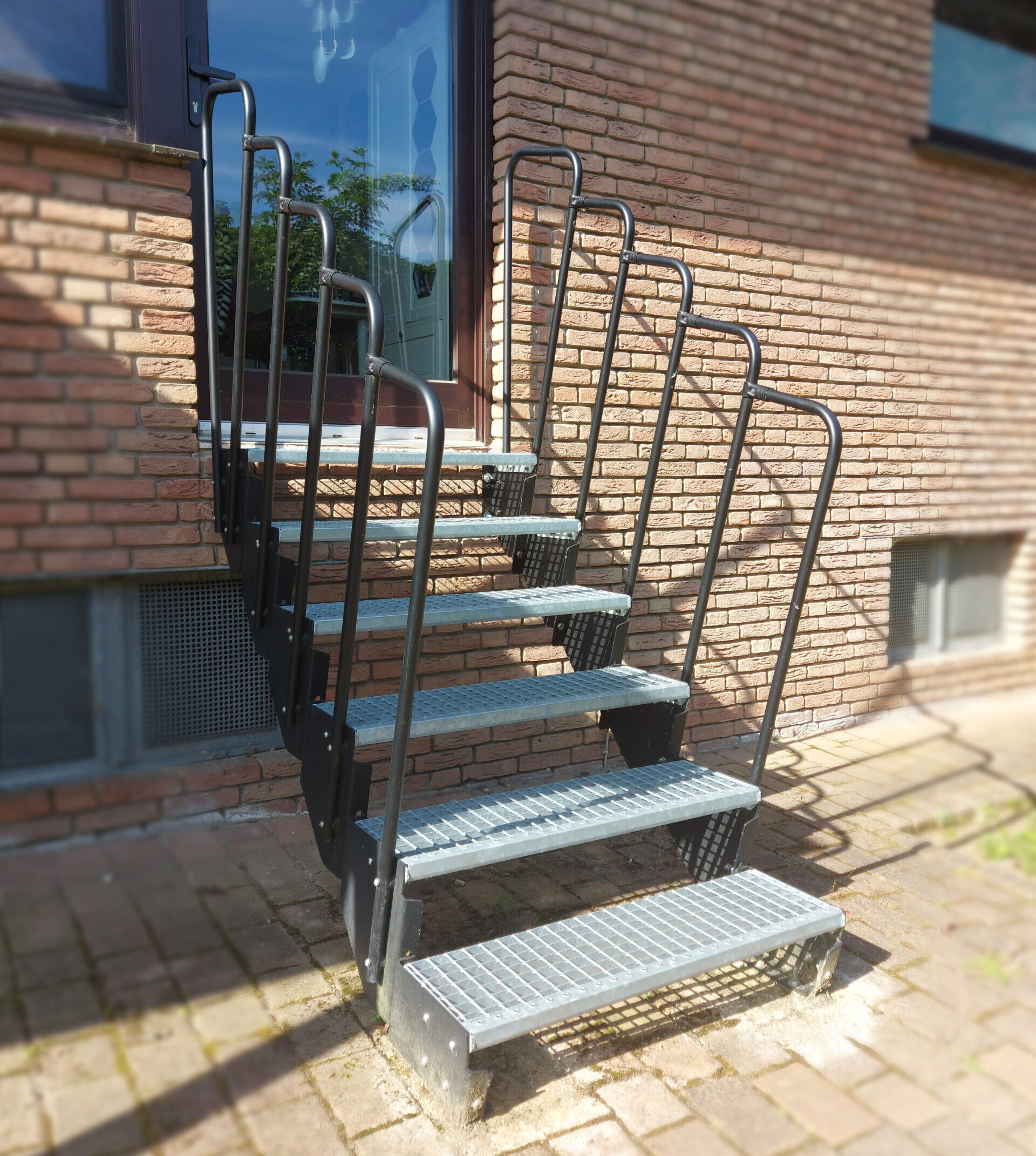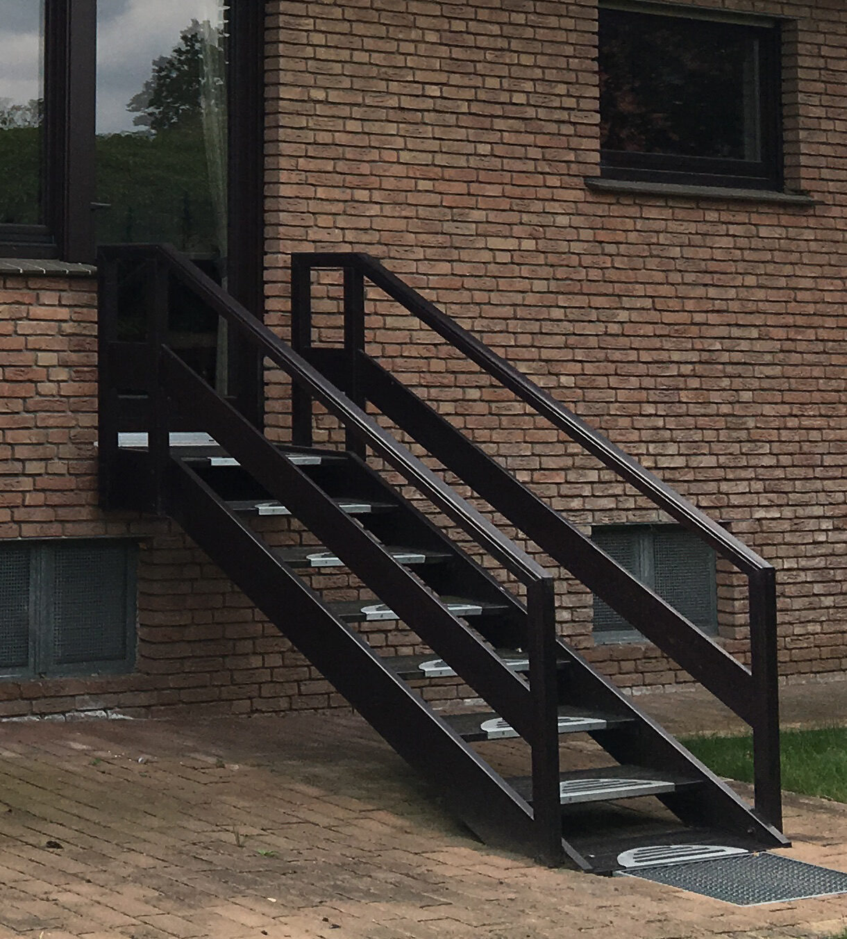 Als wir unser Haus von 1978 kauften, führte vom Hintereingang eine sehr lange (höchstwahrscheinlich eigens geschreinerte) Treppe aus Vollholz in den Garten. Über die Jahre ist das Holz immer stärker verwittert und sowohl die Handläufe als auch die Stufen wurden sehr brüchig. Die Sicherheit der Treppe war nicht mehr gegeben. Wir suchten also nach einer günstigen, langlebigen Alternative, die wir selber installieren konnten. Außerdem sollte die neue Treppe platzsparender und moderner sein, aber trotzdem noch mit der Fassade des Hauses harmonieren.